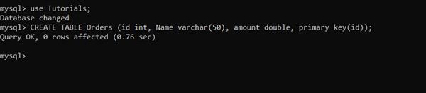 CREATE TABLE Orders (id int, Name varchar(50), amount double, primary key(id));