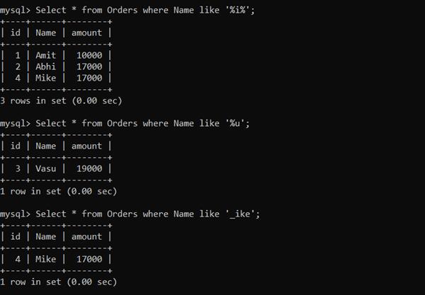 Select * from Orders where Name like '%i%';