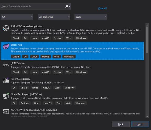 Step 1.1: Open your Visual Studio 2019 and select the option to a create new project with the template of Blazor. So, Search for Blazor template select this and go to next.