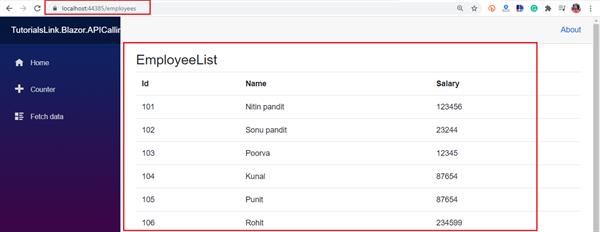 Step 5.6: Now in the GetEmployees() function we will make an HTTP GET request to “api/employees” and will return the accepted JSON from API result. as it’s an async function so with await statement we’ll call GetJsonAsync<>() function. This function will come from the package we installed in Step 3 so don’t forget to use the namespace “using Microsoft.AspNetCore.Components;” with other using statements.