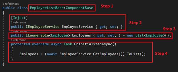 - In EmployeeListBase class, inherits ComponentBase to make this a component class.