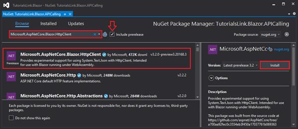 To get this package open NuGet package manager and search for “Microsoft.AspNetCore.Blazor.HttpClient” and don’t forget to click on the checkbox for Pre-release at the right side of the search box.