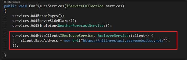 Open Startup.cs file from the root folder of your Blazor Application and add your Blazor Service IEmployeeService with it’s implemented class EmployeeService in ConfigureServices() function and pass a HttpClient object with your API Endpoint path on BaseAddress: