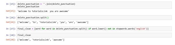 example_sentence = 'Welcome to TutorialsLink ! you are awesome' - Next, we will remove the punctuations and print them