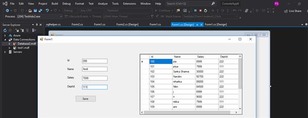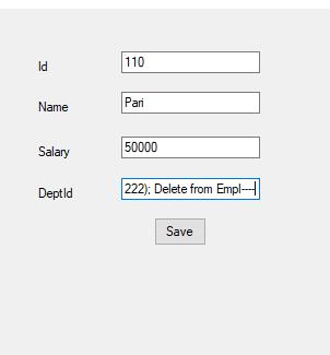 To understand SQL injection, we develop an application for storing the data of employers using Ado.net which takes inputs from the user as id, name, salary, and department id. To develop this application we design the front end as follows