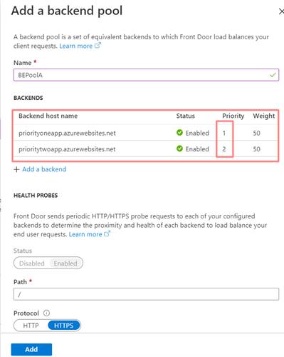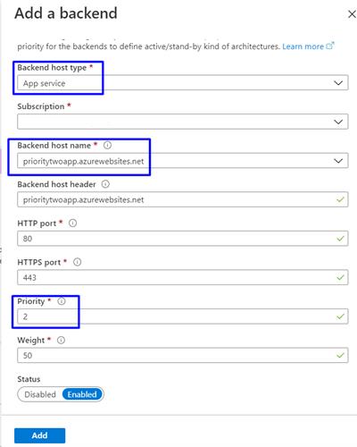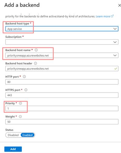 After clicking on the [+ Add a backend], we will get the new blade where we have to set the following properties
