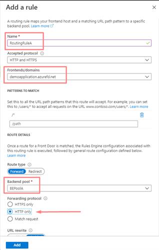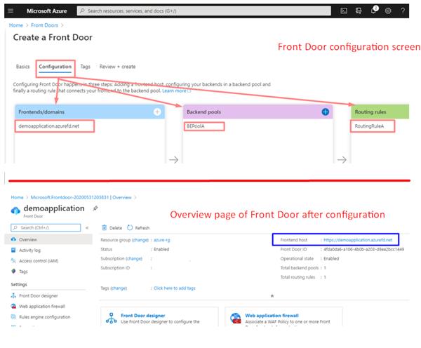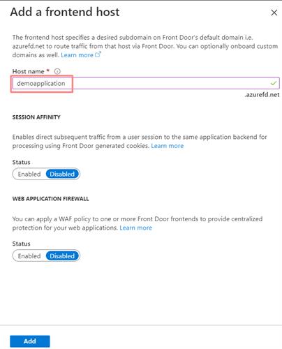Click on [+ Add] button and you will see the Create a Front Door blade and assign the values to the required fields as given in below snapshot.