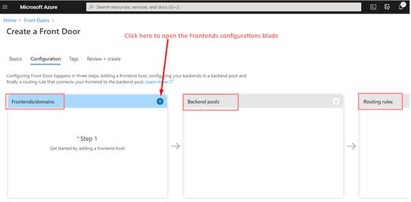 The sub-tabs are Frontends/domains, Backend pools, and Routing rules. We’ll see how to configure all of these sequentially in the below images.