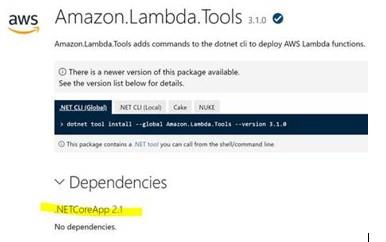 - However, this version of Amazon.Lambda.Tools has a strong dependency on .NETCoreApp 2.1. see below screen shot