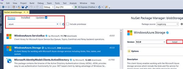 Here we also need to install the Azure storage client packages. So, go to the search box, type the ―Azure Storage Client. After typing, click on ―Install button.