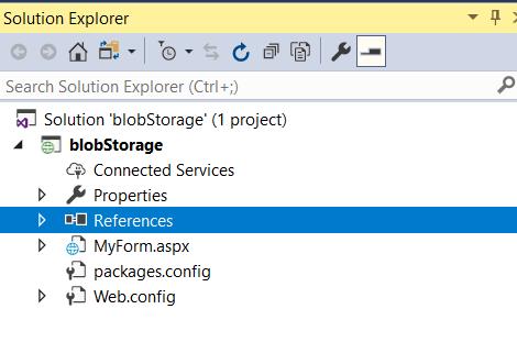 We can see, in our project, there are three types of categories items, properties, References, and Web.config.