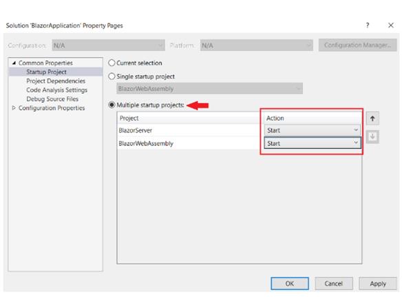 Select Multiple startup Projects radio catch. Select Start from the Action dropdown list against each Project that you need to the arrangement as a startup Project.