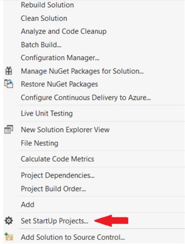 Right snap on the Solution Name in the Solution Explorer and select Set Startup Projects choice.