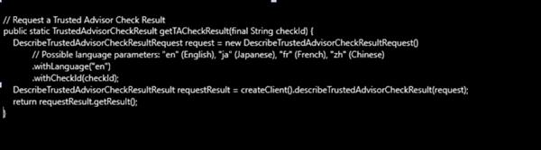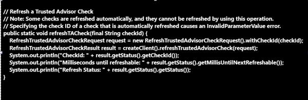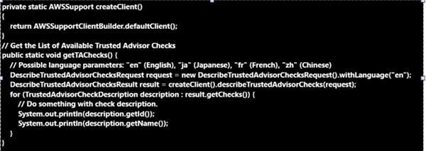 The accompanying Java code scrap makes a case of an AWS Support customer that you can use to call all Trusted Advisor activities. Next, the code gets the rundown of Trusted Advisor checks and their comparing "CheckId" values by calling the "DescribeTrustedAdvisorChecks" activity. You can utilize this data to create UIs that empower clients to choose the check they need to run or revive.