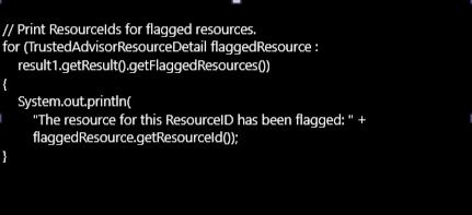 The accompanying Java code piece repeats over the "DescribeTrustedAdvisorCheckResult" Result case returned in the past segment to get a rundown of assets flagged by the Trusted Advisor check.