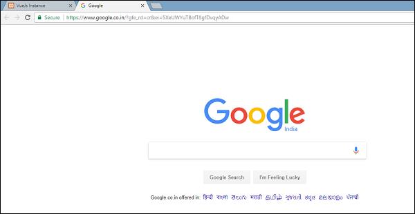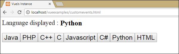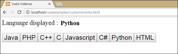 Here, the emit triggers "showlanguage" which in turn calls languagedisp from the Vue instance methods. It assigns the language clicked value to the variable languageclicked and the same is displayed in the browser as shown in the following screenshot.