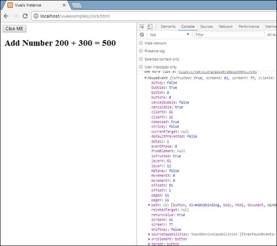 On the click of a button, it will call the method 'displaynumbers', which takes in the event and we have consoled the same in the browser as shown.