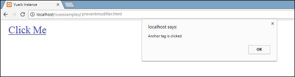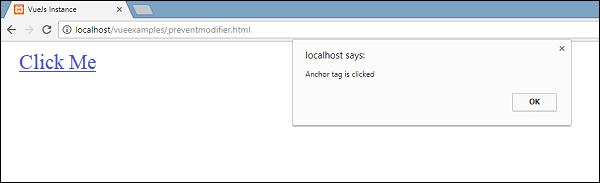 Once added, if we click on the button, it will send an alert message and will not open the link anymore. The prevent modifier prevents the link from opening and only executes the method assigned to the tag.