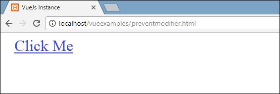 Now this works as a normal way, i.e. the link opens up as we want. In case we don’t want the link to open up, we need to add a modifier ‘prevent’ to the event as shown in the following code.