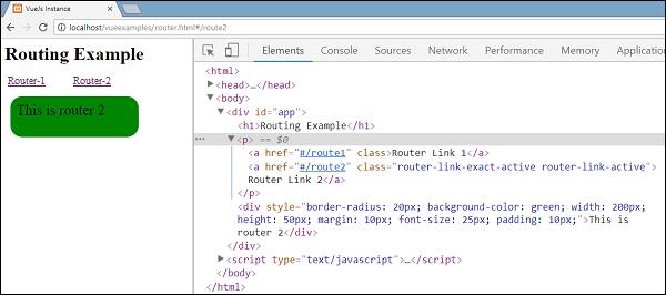 The class added is class = "router-link-exact-active router-link-active". The active link gets the class as shown in the above screen capture. One more thing to notice is, the <router-link> gets rendered as a tag.