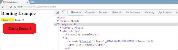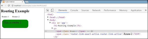 Execute the example and see the display in the browser. On inspecting and checking the router link, we will find that it adds class to the active element as shown in the following screenshot.