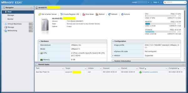 The vSphere Host Client is a graphical user interface program installed on the ESXi host that allows data center administrators to connect to ESXi remotely from any Windows PC. The VMware Host Client allows administrators to perform numerous administrative tasks and monitor the host or virtual machines at the host level. The following image is an example of what an administrator using vSphere Host Client would see: