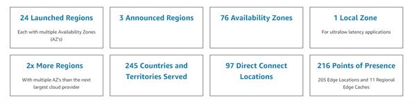 AWS has the widest global cloud infrastructure. No other cloud provider offers as many Regions with multiple Availability Zones connected by high throughput, low latency, and highly superfluous networking.