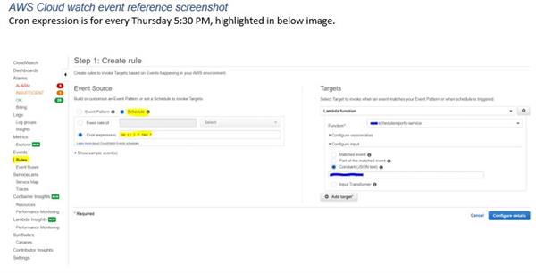 Finally, Cloud watch events is main stuff which trigger the AWS Lambda function based on the configured schedule. Here we used the Cron expression to schedule a job on specific time.