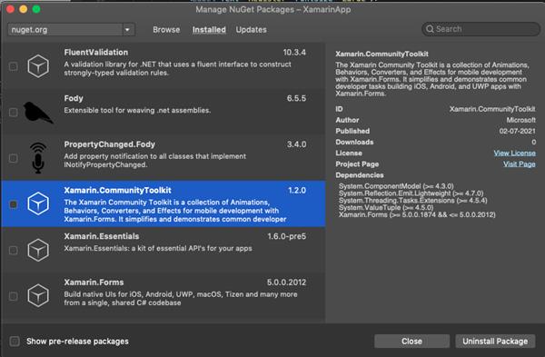 The Xamarin Community Toolkit is available as a Visual Studio NuGet package for new or existing Xamarin.Forms projects.